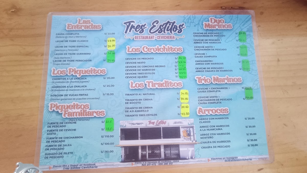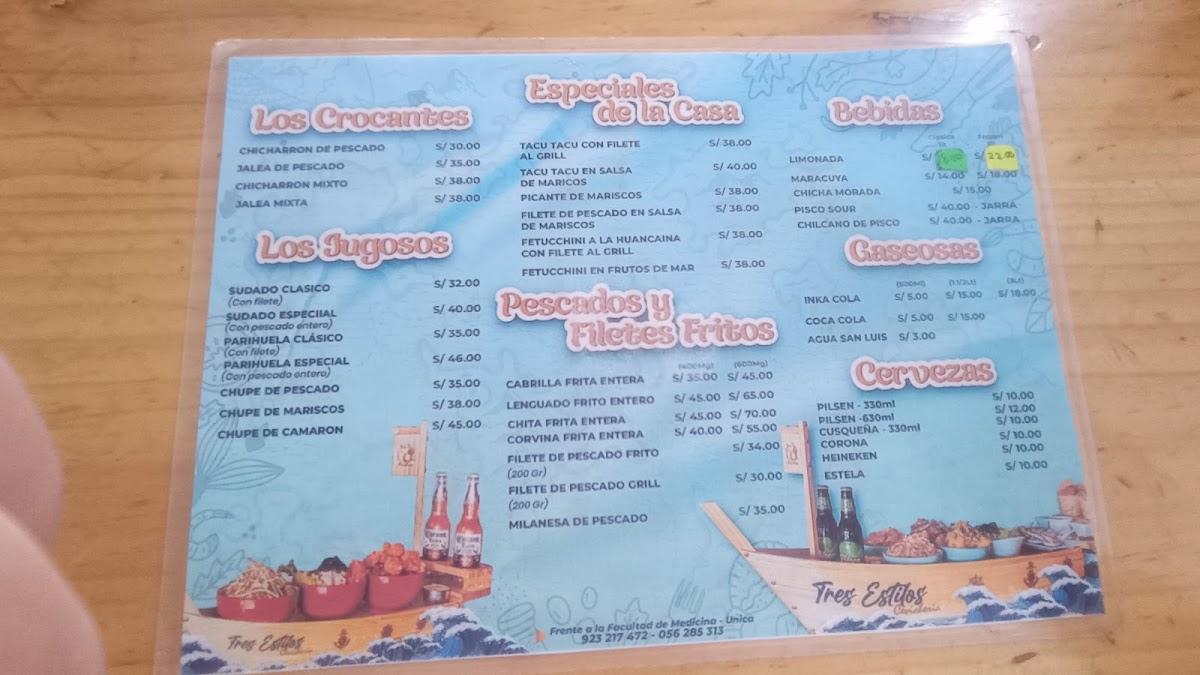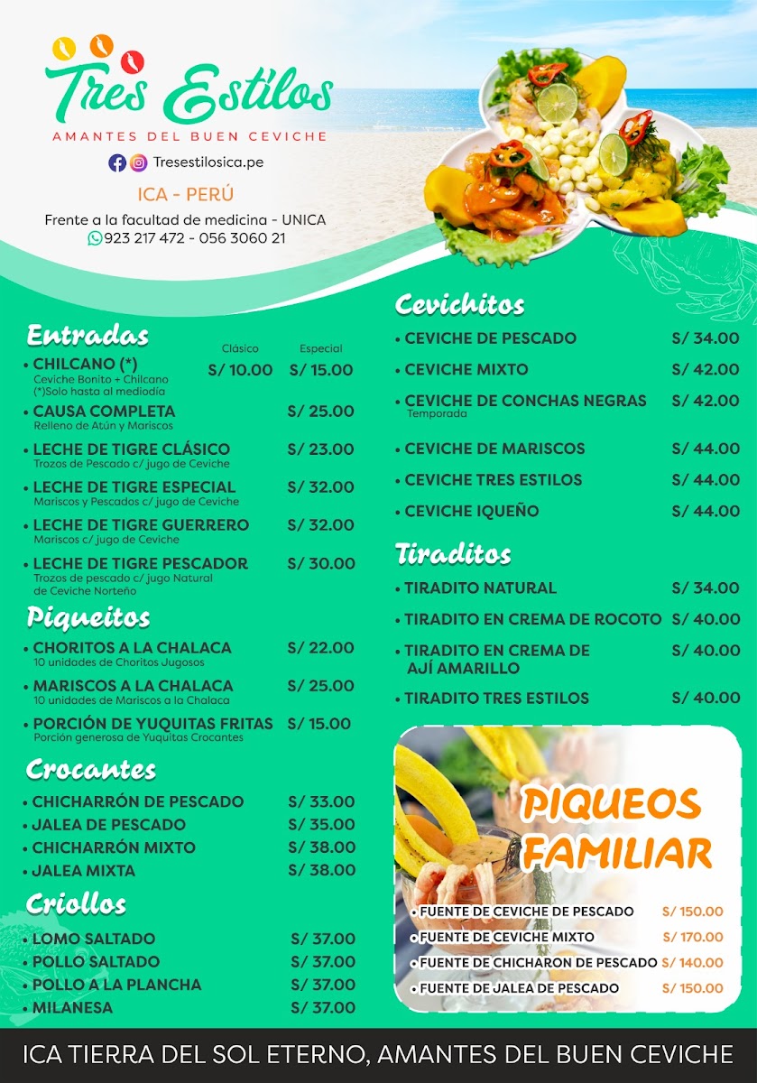 Cevicheria Tres Estilos in Pacaes, Ica, Peru, offers a menu that balances classic Peruvian flavors with inventive seafood creations, making it a standout destination for both locals and travelers. The Entradas section features refreshing starters like CHILCANO, CAUSA COMPLETA, and the tangy LECHE DE TIGRE CLÁSICO, alongside the more robust LECHE DE TIGRE ESPECIAL and LECHE DE TIGRE GUERRERO. For those craving ceviche, the Cevichitos selection shines with CEVICHE DE PESCADO, CEVICHE MIXTO, CEVICHE DE CONCHAS NEGRAS, CEVICHE DE MARISCOS, and the signature CEVICHE TRES ESTILOS. The Tiraditos offer delicate, sliced fish dishes including TIRADITO NATURAL, TIRADITO EN CREMA DE ROCOTO, TIRADITO EN CREMA DE AJÍ AMARILLO, and the elegantly composed TIRADITO TRES ESTILOS. Smaller bites, or Piqueitos, like CHORITOS A LA CHALACA, MARISCOS A LA CHALACA, and a PORCIÓN DE YUQUITAS FRITAS provide a perfect accompaniment to any main dish. For those who enjoy crispy textures, the Crocantes section features CHICHARRÓN DE PESCADO, JALEA DE PESCADO, CHICHARRÓN MIXTO, and JALEA MIXTA. The Criollos menu includes hearty favorites such as LOMO SALTADO, POLLO SALTADO, POLLO A LA PLANCHA, and MILANESA, catering to traditional tastes. For larger gatherings, the PIQUEOS FAMILIAR offers generous platters like FUENTE DE CEVICHE DE PESCADO, FUENTE DE CEVICHE MIXTO, FUENTE DE CHICHARRÓN DE PESCADO, and FUENTE DE JALEA DE PESCADO, making it ideal for sharing. Overall, the menu at Cevicheria Tres Estilos successfully showcases a diverse range of Peruvian seafood and classic dishes, with each item thoughtfully prepared to highlight fresh ingredients and bold flavors. The combination of ceviches, tiraditos, and family-style portions ensures that every diner can experience the best of Ica’s coastal cuisine in one visit.
